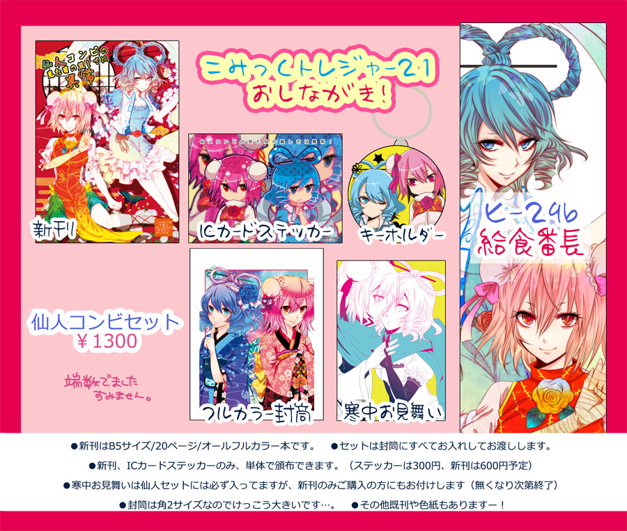 例大祭はそんなかんじですかね…あと既刊の仙人本やグッズ、雛ちゃん本なんかも明日まとめて宅配に出しときます。